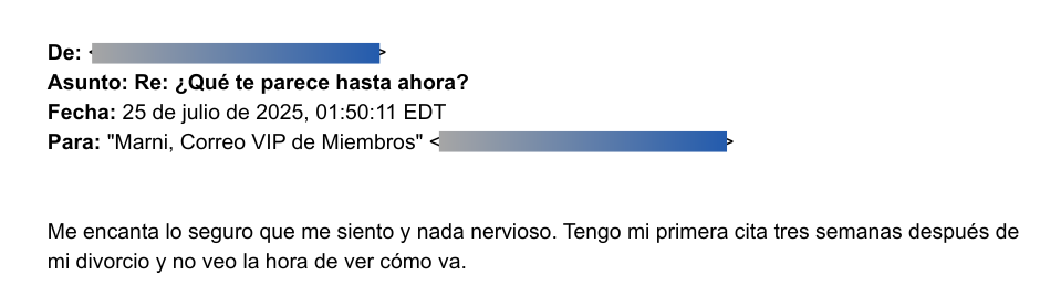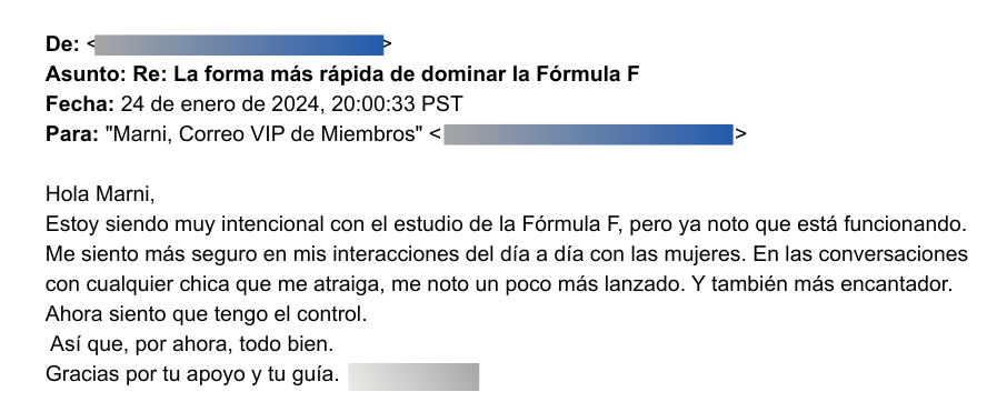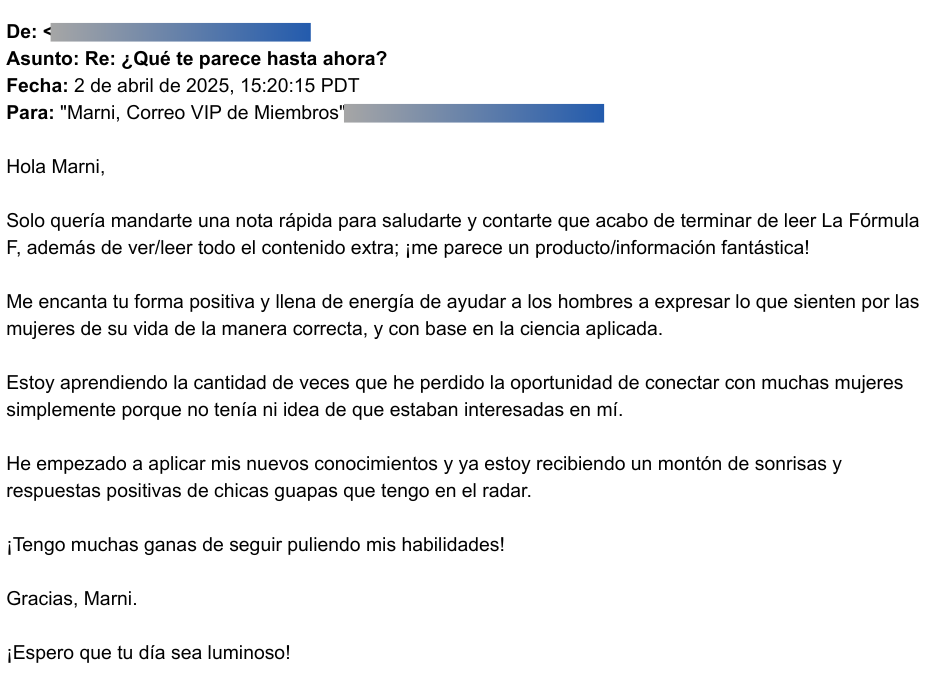 "Querida Marni, soy nuevo en las citas a los 40. Soy atractivo y seguro de mí mismo, y puedo atraer a mujeres mucho más jóvenes que yo, pero me faltaba un pequeño detalle sobre cómo cerrar el trato con ellas. Compré La Fórmula F y fue justo el empujón de información que necesitaba.