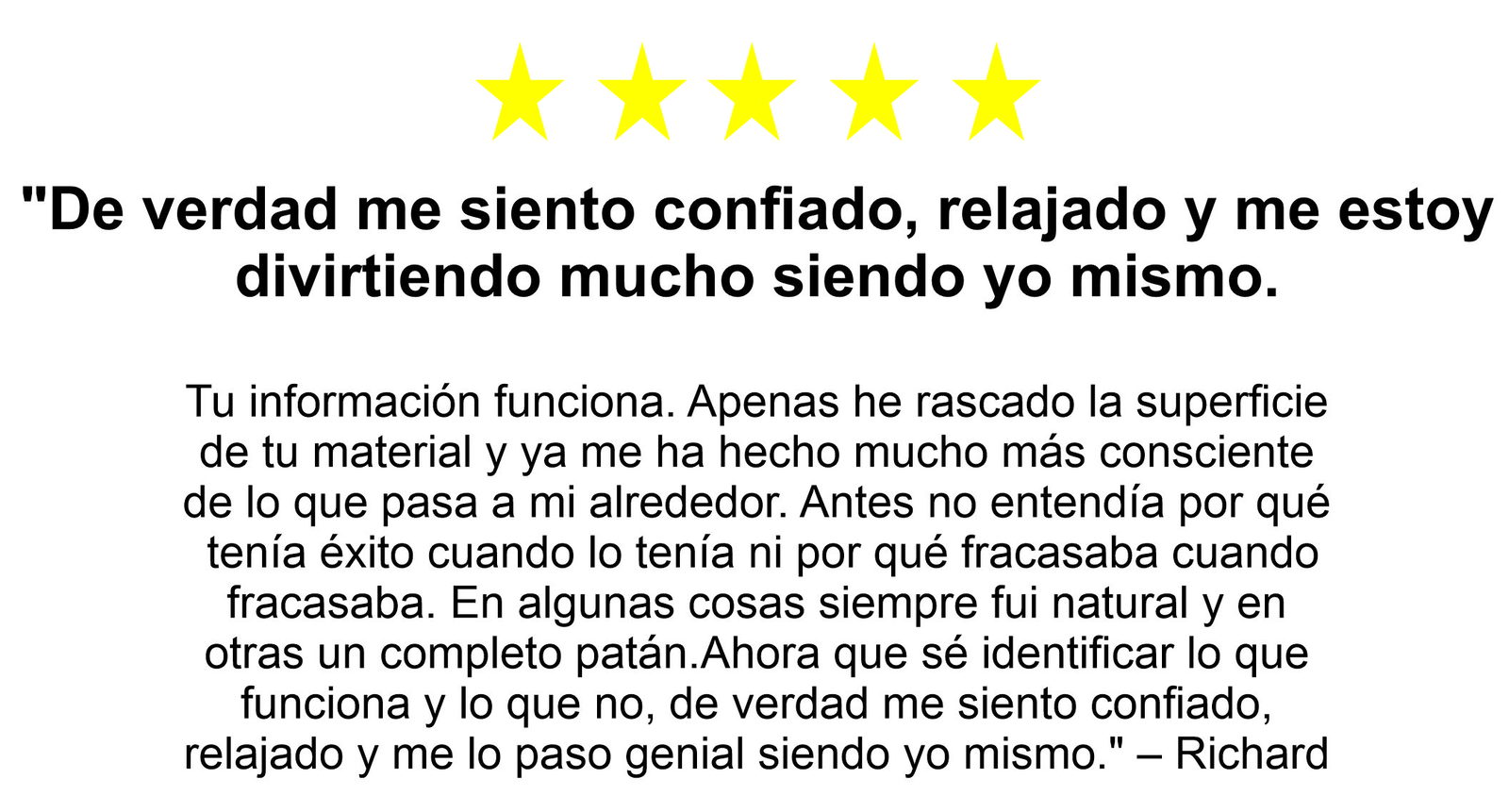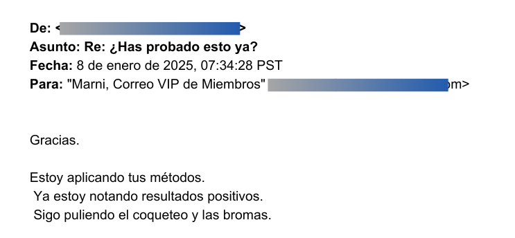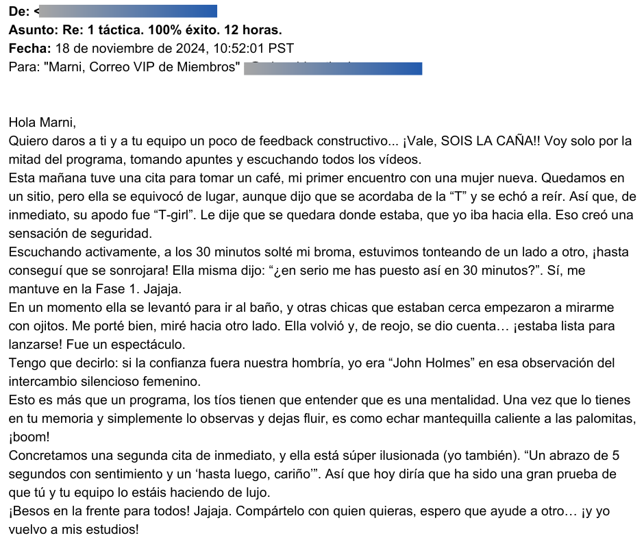 "Gracias por crear productos tan geniales. Aunque los he comprado hace poco, ya han empezado a tener un gran impacto en mi nivel de confianza con las mujeres."