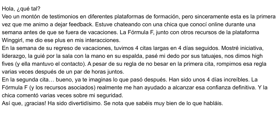 Quedé con una chica decidido a usar el enfoque que se explica en el programa, y la cita salió bien como de costumbre, pero ella se fue a casa conmigo esa misma noche. El cambio principal fue que, en lugar de quedarme atrás, dejé claras mis intenciones con ella, gracias a los consejos que aprendí en La Fórmula F.