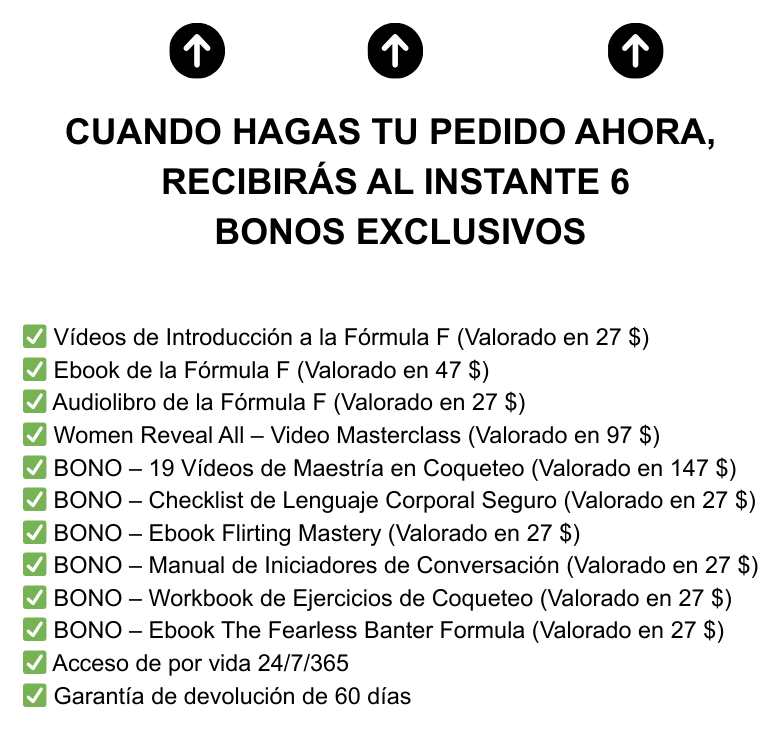 ✅ Habilidades permanentes que usarás de por vida — a diferencia de los “trucos rápidos para ligar”, la Fórmula F se convierte en parte de quien eres, por lo que nunca más te sentirás perdido o fuera de control.
